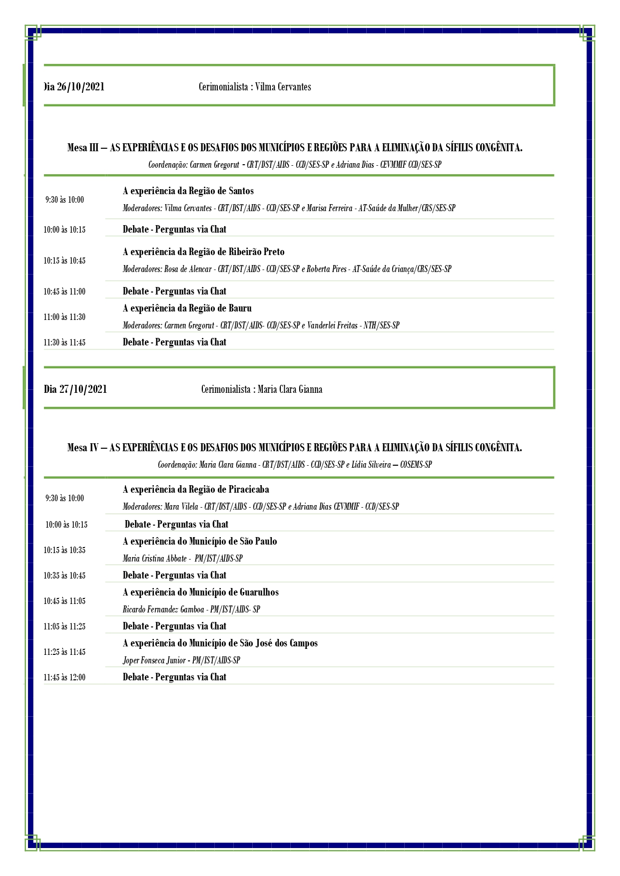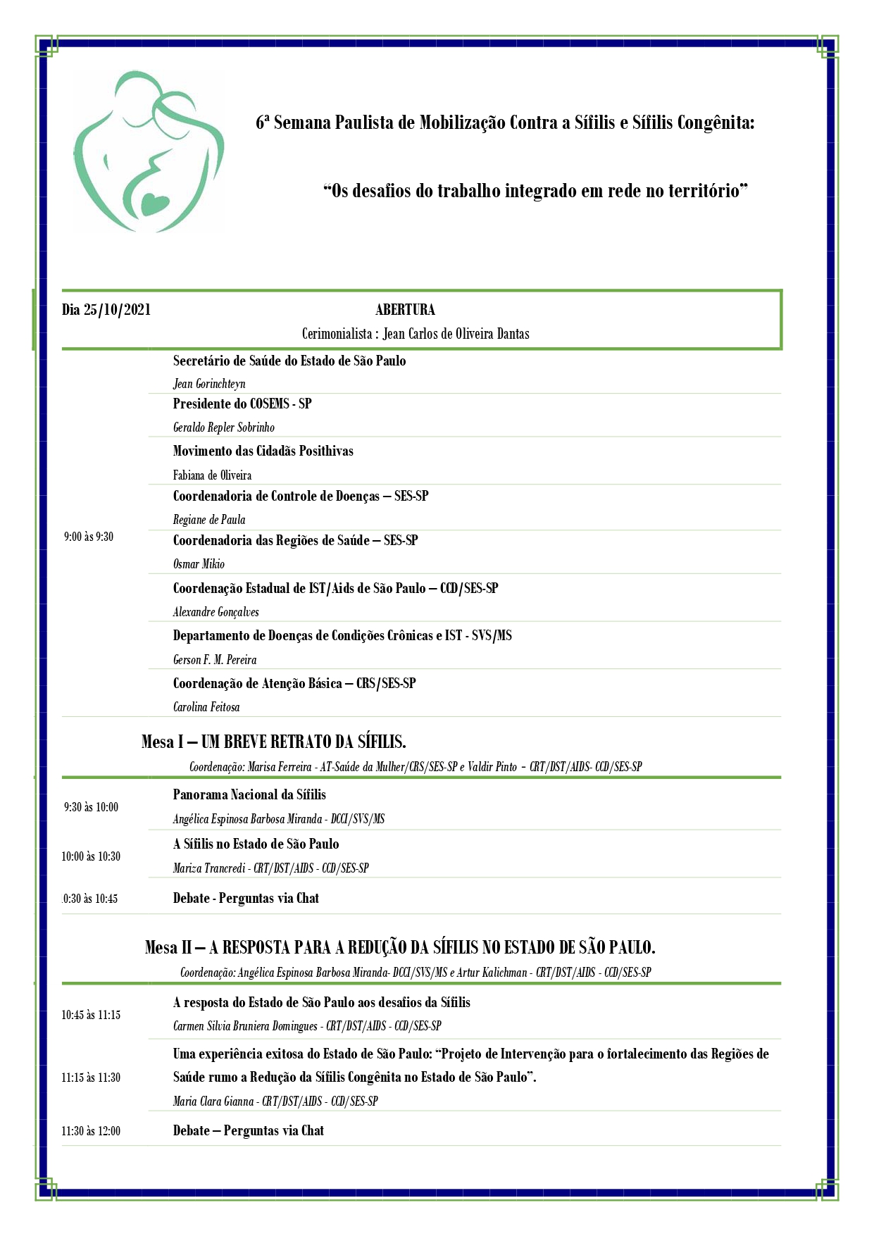 O evento será no formato de Webinar, nos dias 25 e 26 E 27 de outubro, das 9h às 12h00. São convidados para o evento: DCCI/Ministério da Saúde, COSEMS/SP, Diretores de DRS e de GVE, Interlocutores de IST/Aids, Articuladores Estaduais das Áreas Técnicas de Humanização, Atenção Básica, Saúde da Mulher e da Criança, Secretários Municipais de Saúde, Coordenadores Municipais das Áreas de IST/Aids, Atenção Básica, Saúde da Mulher e da Criança, Rede Especializada, Maternidades, Comitês de Morte Materna e Infantil, estudantes da área da saúde e representantes da Sociedade Civil