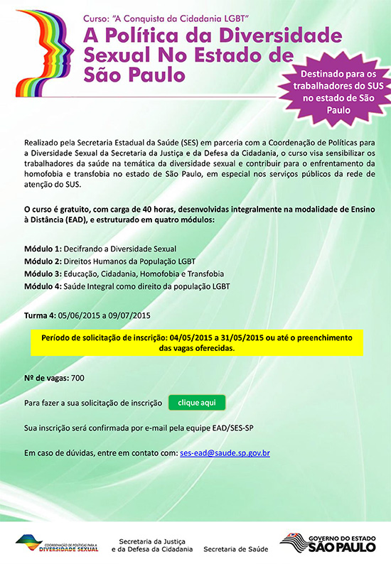 CURSO: "A CONQUISTA DA CIDADANIA LGBT" Destinado para os trabalhadores do SUS no estado de São Paulo. O curso é gratuito na modalidade de Ensino à Distância (EAD).