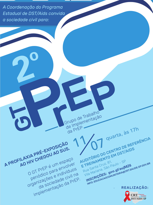 O GT PrEP (Grupo de Trabalho de Implementação da PrEP) é o espaço onde a sociedade civil acompanha e contribui para a implementação do novo método de prevenção ao HIV, a PrEP (profilaxia pré-exposição), junto ao Programa Estadual de IST/Aids do estado de São Paulo.