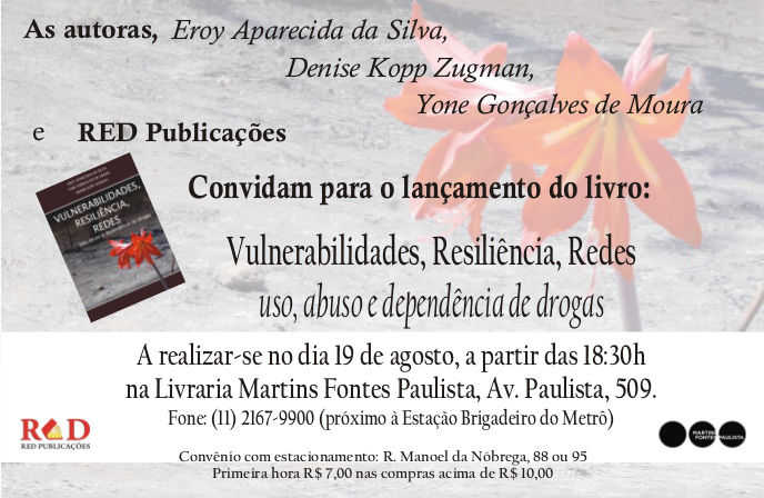 Convidamos a tod@s para o lançamento do livro VULNERABILIDADES, RESILIÊNCIA, REDES - USO, ABUSO E DEPENDÊNCIA DE DROGAS, organizado por Eroy Aparecida da Silva, Denise Kopp Zugman e Yone Gonçalves de Moura (Universidade Federal de São Paulo) amanhã, dia 19 de agosto, a partir das 18h30, na Livraria Martins Fontes Paulista (Av. Paulista, 509).