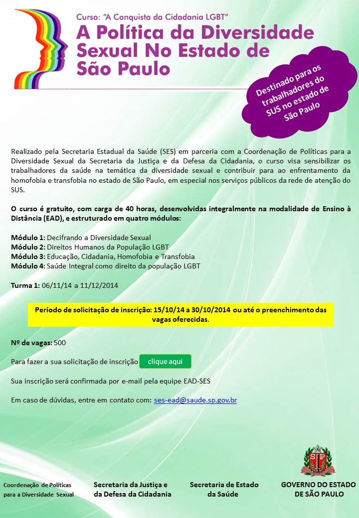 A Secretaria de estado da Saúde em parceria com a Secretaria da Justiça e Cidadania lançou neste dia 15 de outubro o curso de ensino à distância (EAD): "A Conquista da cidadania LGBT - a política da diversidade sexual no estado de São Paulo".