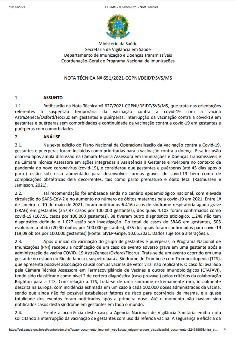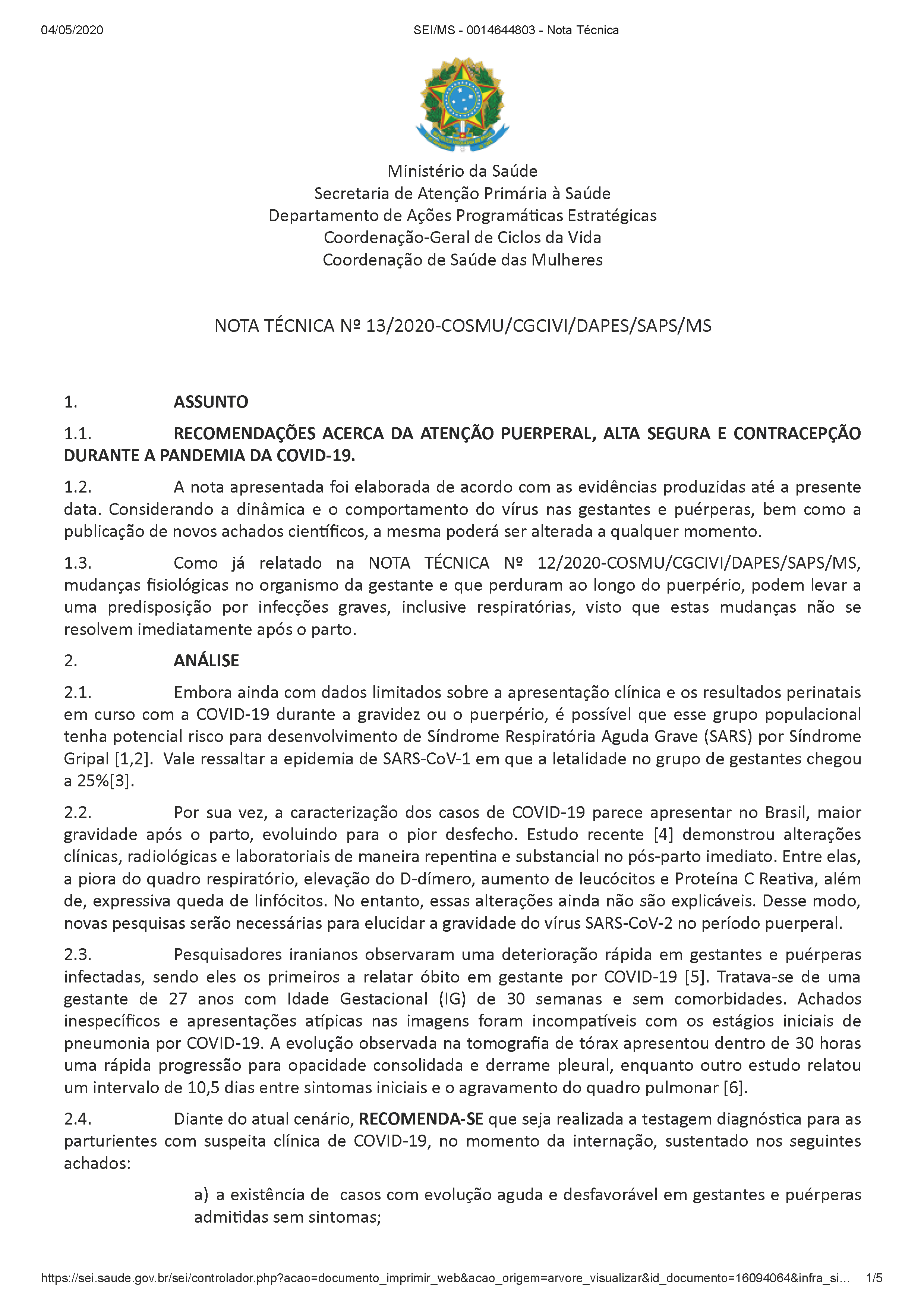 ![]() Manejo do ciclo gravídico puerperal e lactação Nota Técnica nº 3 de 1/4/2020 |