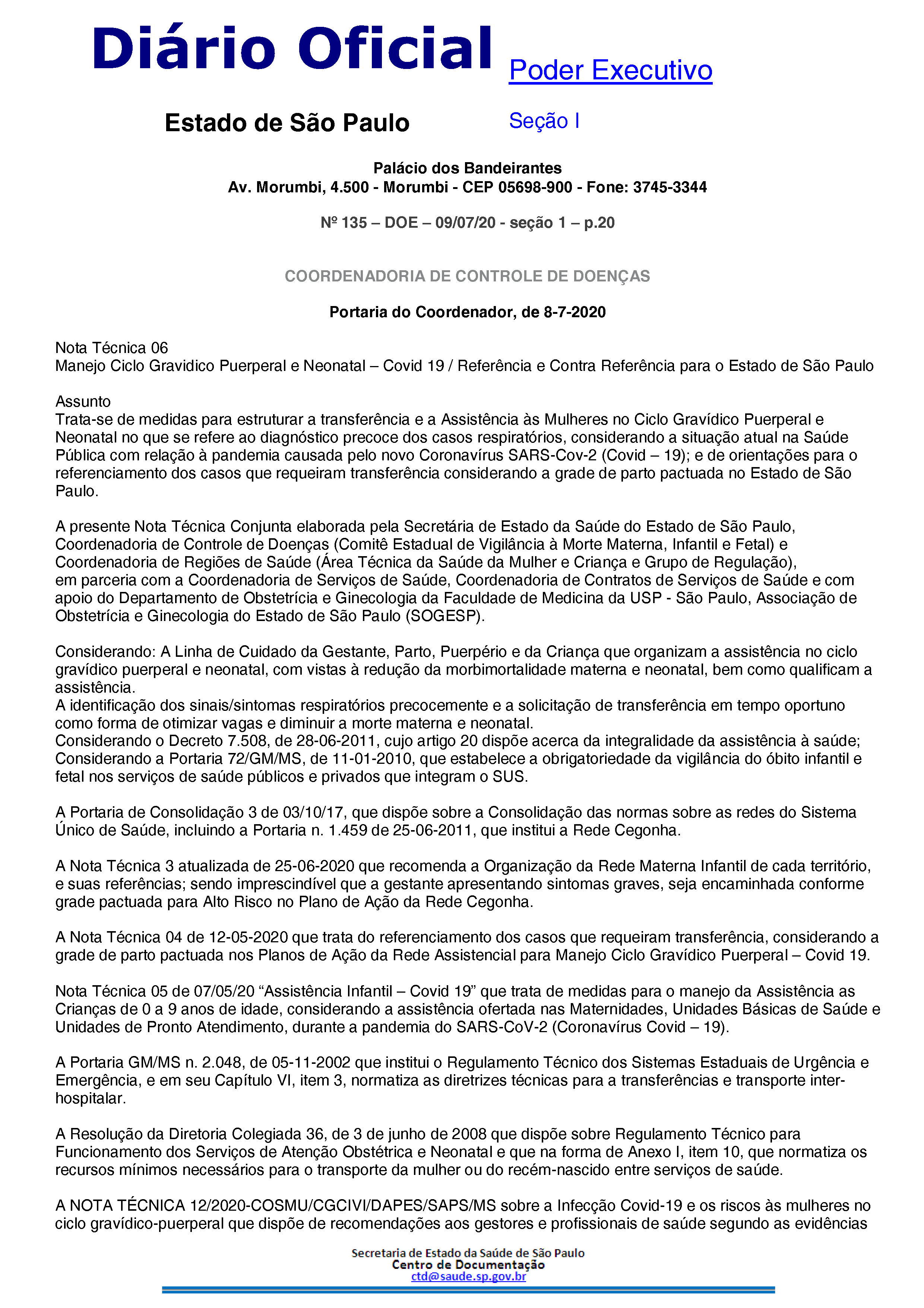 ![]() Atualização - Nota Técnica nº 04, de 12/05/2020 e NT-CCD-4_REP 2020 Regulação Região Metropolitana São Paulo Manejo Ciclo Gravidico Puerperal – Covid 19 / Referência e Contra Referência para o Estado de São Paulo Assunto Trata-se de medidas para o Manejo da Assistência as Mulheres no Ciclo Gravídico Puerperal no que se refere ao diagnóstico precoce dos casos considerando a situação atual na Saúde Pública com relação à pandemia causada pelo novo Coronavírus Sars-Cov -2 (Covid – 19); e de orientações para o referenciamento dos casos que requeiram transferência considerando a grade de parto pactuada no Estado de São Paulo. |
