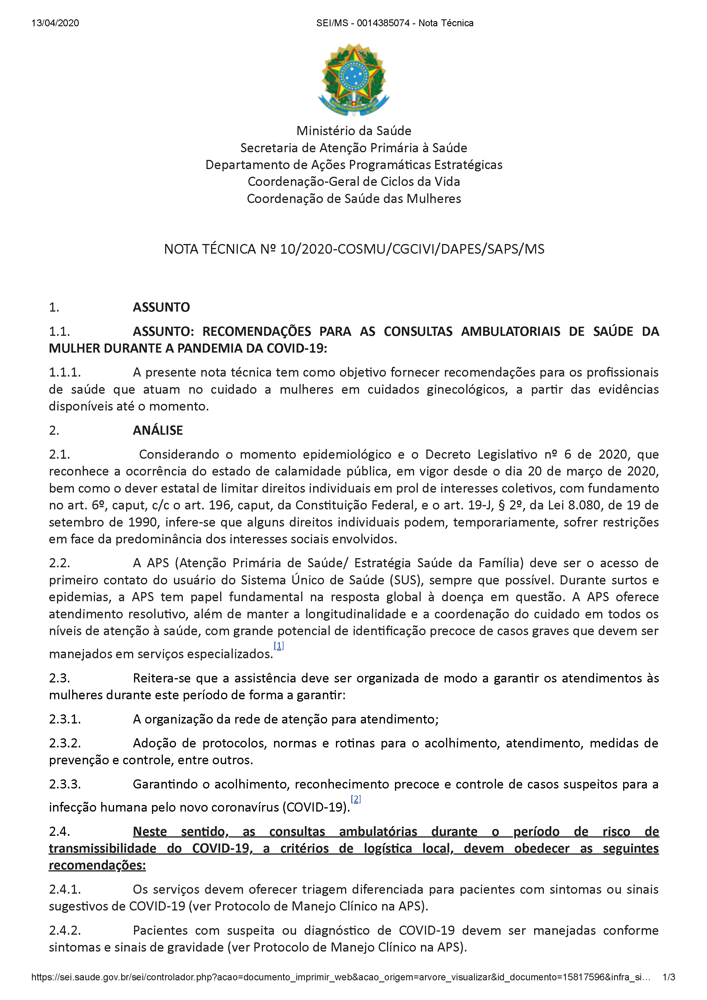 ![]() Nota técnica 10 - Recomendações para as consultas ambulatoriais de saúde da mulher durante a pandemia da COVID-19 1. ASSUNTO |