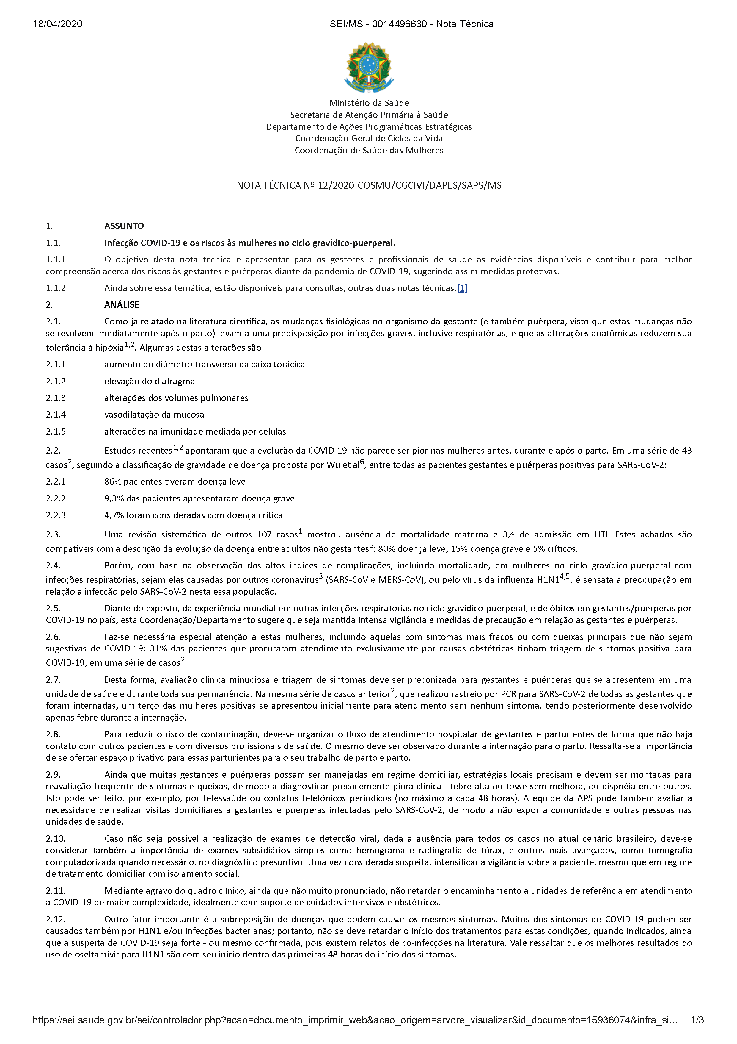 Nota técnica 12 - Infecção COVID-19 1. ASSUNTO 1.1.1. O objetivo desta nota técnica é apresentar para os gestores e profissionais de saúde as evidências disponíveis e contribuir para melhor compreensão acerca dos riscos às gestantes e puérperas diante da pandemia de COVID-19, sugerindo assim medidas protetivas. |