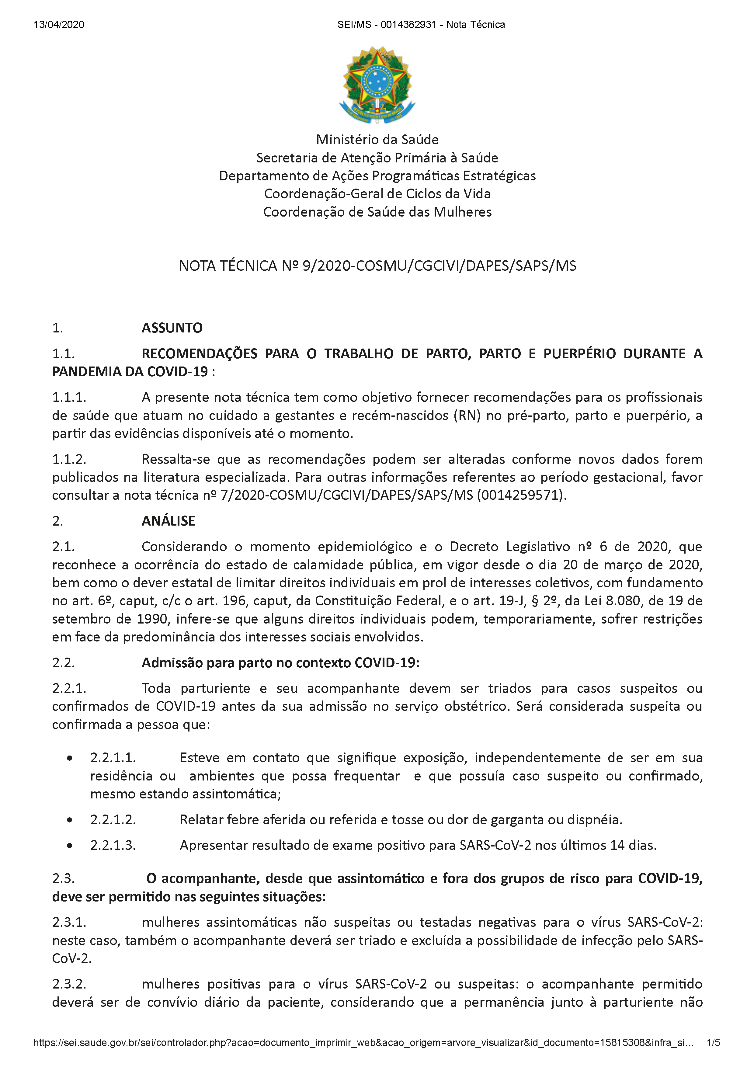 ![]() Nota Técnica n 5 de 07/05/2020 Assistência Infantil - Covid 19 Trata-se de medidas para o manejo da Assistência as Mulheres no Ciclo Gravídico Puerperal e para o Recém Nascido, no que se referem à lactação, justificadas pela situação na Saúde Pública em relação à. |