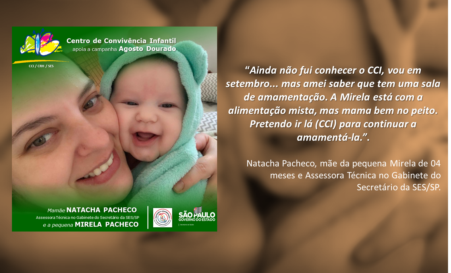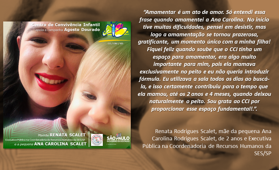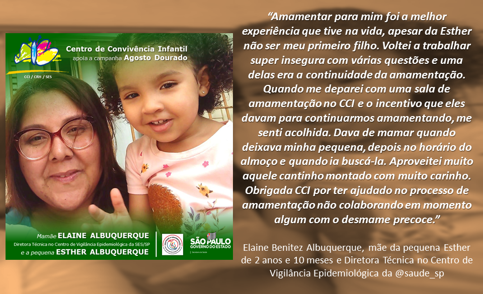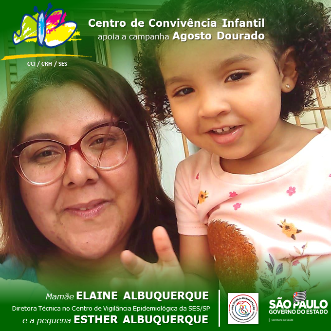 Durante o mês de agosto realiza-se na área da saúde a campanha "Agosto Dourado" que busca destacar a luta pelo incentivo à amamentação, observando que a cor dourada está relacionada ao padrão ouro de qualidade do leite materno, e entre os dias 01 a 07 de agosto, realiza-se a Semana Mundial de Aleitamento Materno, que este ano tem como tema "Proteger a Amamentação: uma responsabilidade de todos", ação que o CCI vem reforçando desde a implantação de sala acreditada pelo Ministério da Saúde, exclusiva para o aleitamento materno, que recebe mães trabalhadoras da SES-SP e seus bebês.