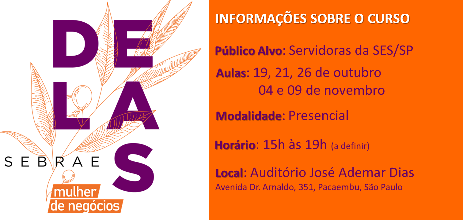 A CRH em atenção à campanha "Outubro Rosa" que tem por objetivo realizar ações de prevenção ao câncer de mama, bem como outras ações voltadas ao público feminino, abre inscrição para o "Sebrae DELAS" um projeto somente para mulheres, pautado na Política de Gestão de Pessoas da Secretaria da Saúde, contemplado no eixo Bem-estar e Satisfação como uma ação de responsabilidade social.