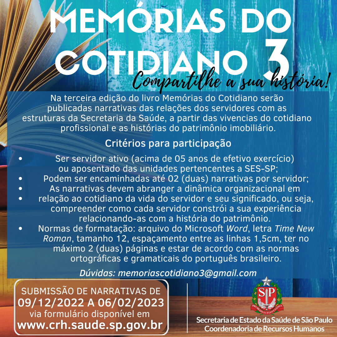 A coleção "Memórias do Cotidiano" terá o terceiro número publicado com objetivo de registrar as relações dos servidores com as estruturas da SES/SP, descrevendo suas vivências do cotidiano profissional e as histórias do patrimônio imobiliário. Além das narrativas dos Servidores nesta edição serão evidenciadas as arquiteturas de prédios onde estão instalados serviços de saúde da Secretaria.