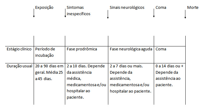 É composto por várias fases: a) prodrômica, b) neurológica aguda, c) coma e d) morte.